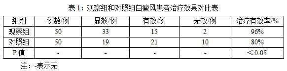 ѡȡ¸÷ÀàÐͰ×ñ°·ç»¼Õß100Àý£¬ÄÐ46Àý£¬Å®54Àý£¬ÄêÁäΪ16~45Ë꣬ƽ¾ùÄêÁäΪ(30¡À0.5)Ë꣬°×ñ°·ç²¡³ÌΪ1m~5y£¬Æ½¾ù²¡³ÌΪ(2¡À0.5)y£¬ÆäÖоÖÏÞÐÔ°×ñ°·ç28Àý¡¢É¢·¢ÐÔ°×ñ°·ç34Àý¡¢·º·¢ÐÔ°×ñ°·ç22Àý¡¢Ö«¶ËÐÔ°×ñ°·ç16Àý;°×ñ°·ç´¦ÓÚ½øÕ¹ÆÚ87Àý¡¢°×ñ°·ç´¦ÓÚÎȶ¨ÆÚ13Àý¡£ËùÓл¼Õß¾ùÎÞÆäËûÑÏÖØÐÄ¡¢¸Î¡¢·ÎµÈϵͳ¼²²¡£¬ÔÚÕ÷µÃ»¼Õß¼°¼ÒÊôͬÒâµÄÇé¿öÏ£¬½«ËùÓл¼Õß°´¾ÍÕï˳Ðò±àºÅËæ»ú·ÖΪ¶ÔÕÕ×é(50Àý)ºÍ¹Û²ì×é(50Àý)£¬Á½×黼ÕßÁÙ´²×ÊÁϲîÒì²»Ã÷ÏÔ£¬ÔÚͳ¼ÆÑ§ÉÏÎÞÒâÒå(P>0.05)£¬¾ßÓпɱÈÐÔ¡£